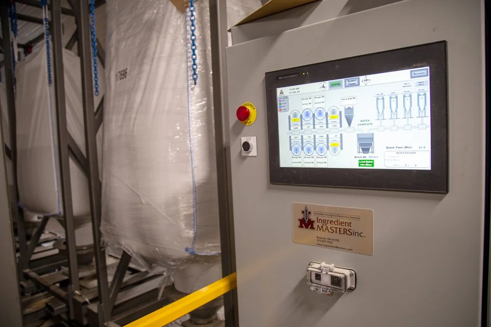 The installation of the Ingredient Masters system has changed that completely. It introduced pre-batch hoppers, automated ingredient dispensing, and the ability to weigh materials with high accuracy. According to Yoder, this has at least doubled—if not tripled—their mixing output.